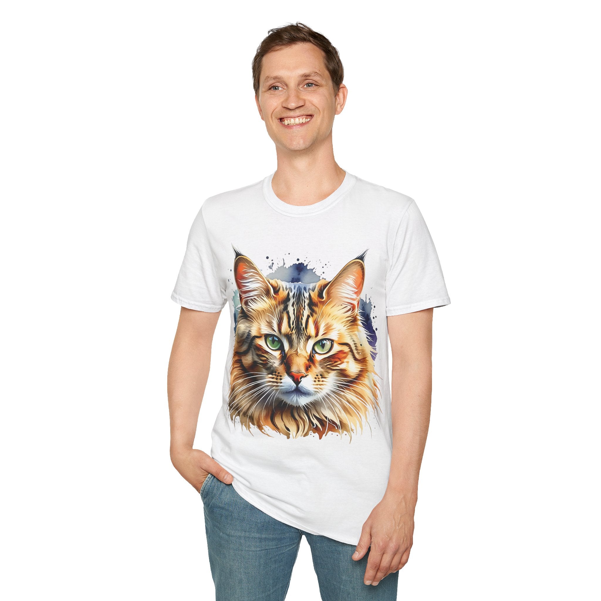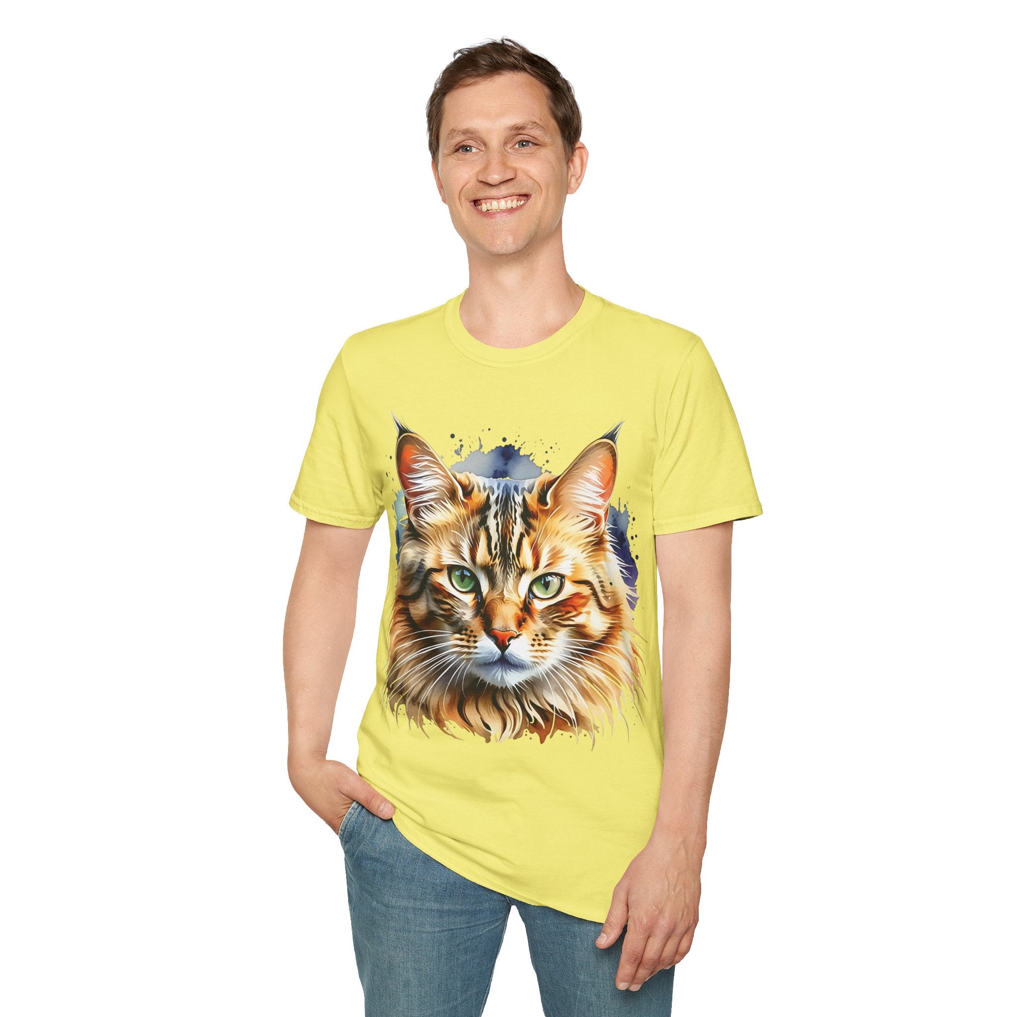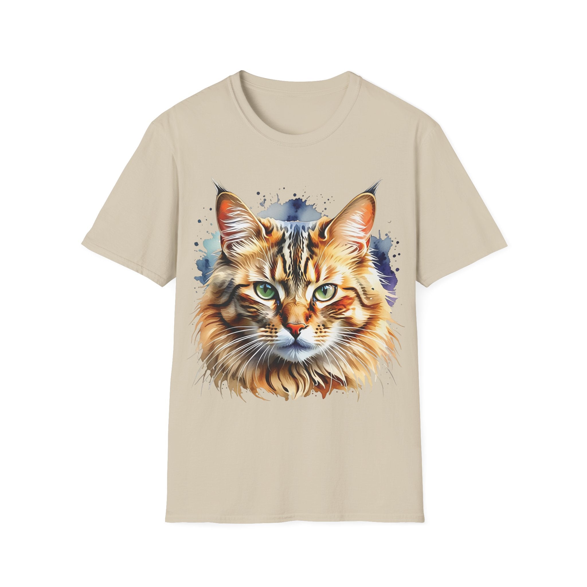 Indulge in the beauty of a Watercolor Cat Head Cotton T-Shirt featuring a vivid, artistically crafted feline portrait. This Unisex T-Shirt introduces warm amber eyes and layered fur tones, creating a unique statement for animal lovers and art enthusiasts. Perfect for everyday wear, it embodies moments of tranquility and companionship. Crafted from 100% ring-spun cotton (153 g/m²), this lightweight shirt offers breathability and comfort. The tubular knit construction maintains a clean silhouette, while the ribbed collar ensures shape retention. Available in sizes S to 3XL.