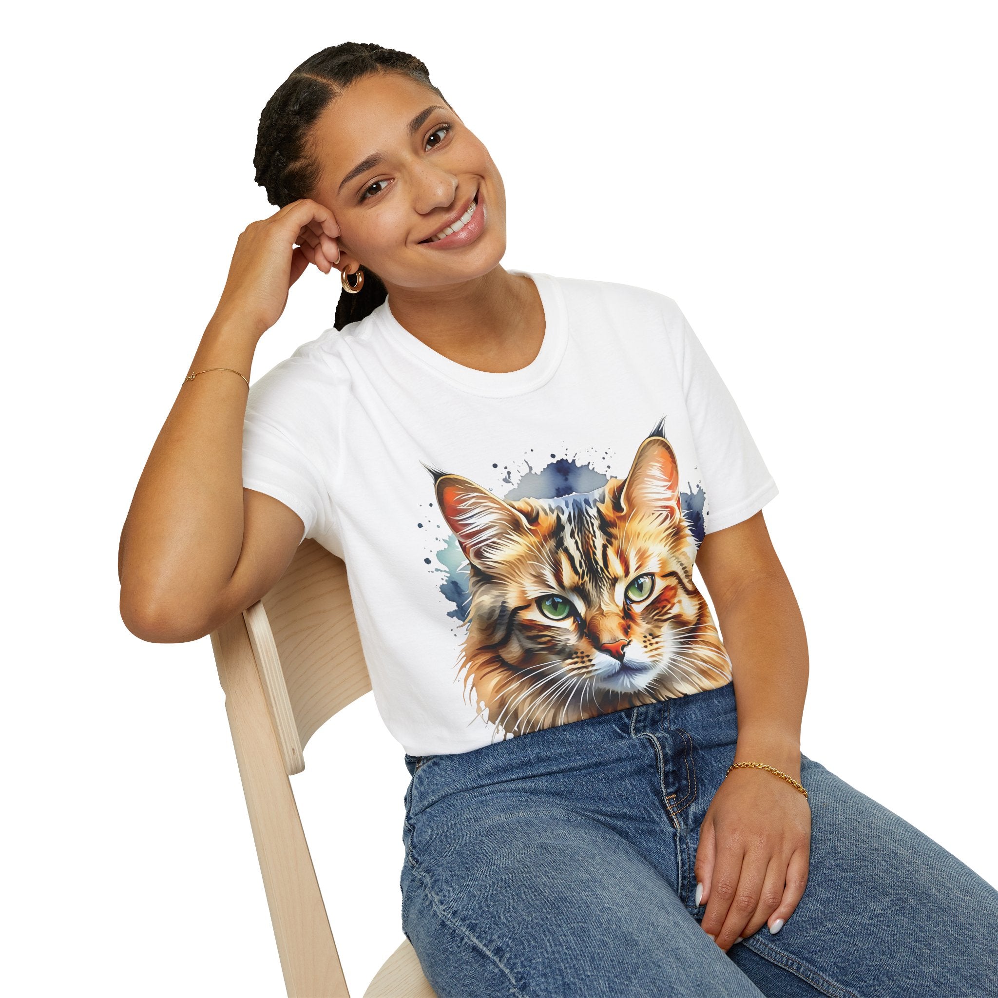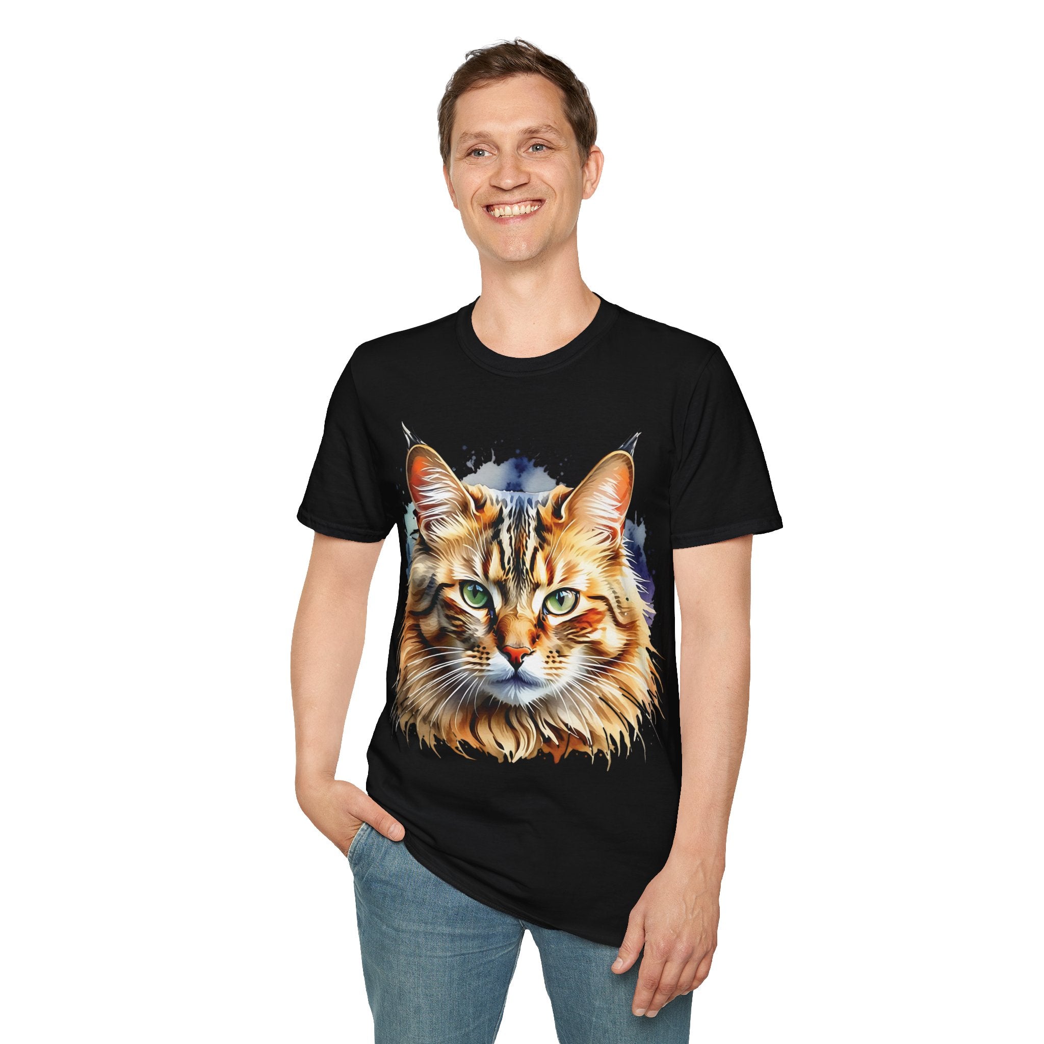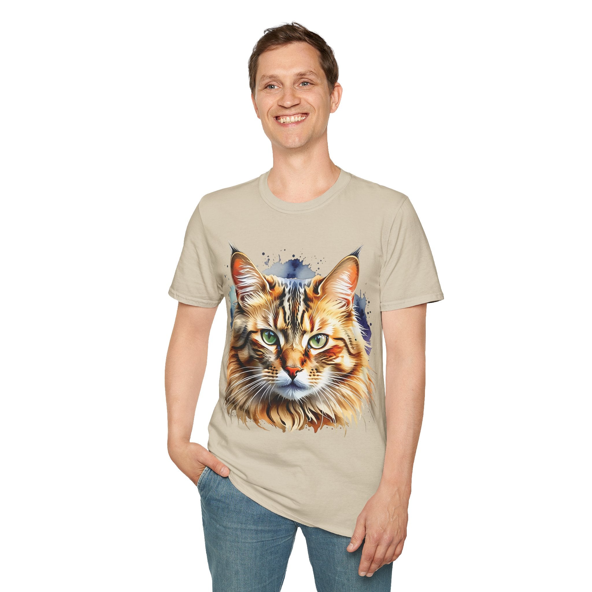 Indulge in the beauty of a Watercolor Cat Head Cotton T-Shirt featuring a vivid, artistically crafted feline portrait. This Unisex T-Shirt introduces warm amber eyes and layered fur tones, creating a unique statement for animal lovers and art enthusiasts. Perfect for everyday wear, it embodies moments of tranquility and companionship. Crafted from 100% ring-spun cotton (153 g/m²), this lightweight shirt offers breathability and comfort. The tubular knit construction maintains a clean silhouette, while the ribbed collar ensures shape retention. Available in sizes S to 3XL.